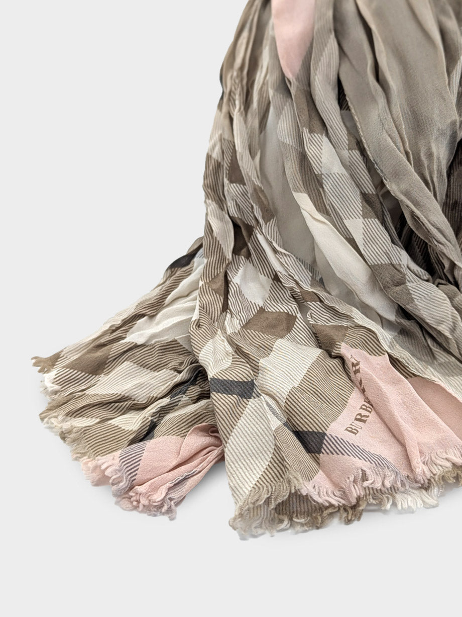 A refined, lightweight scarf woven in a luxurious blend of wool and silk, showcasing Burberry’s iconic check motif in a classic palette. This elongated rectangular design delivers elegant drape and versatility — wear it as a wrap, overcoat accent, or loose around the neck for effortless sophistication.