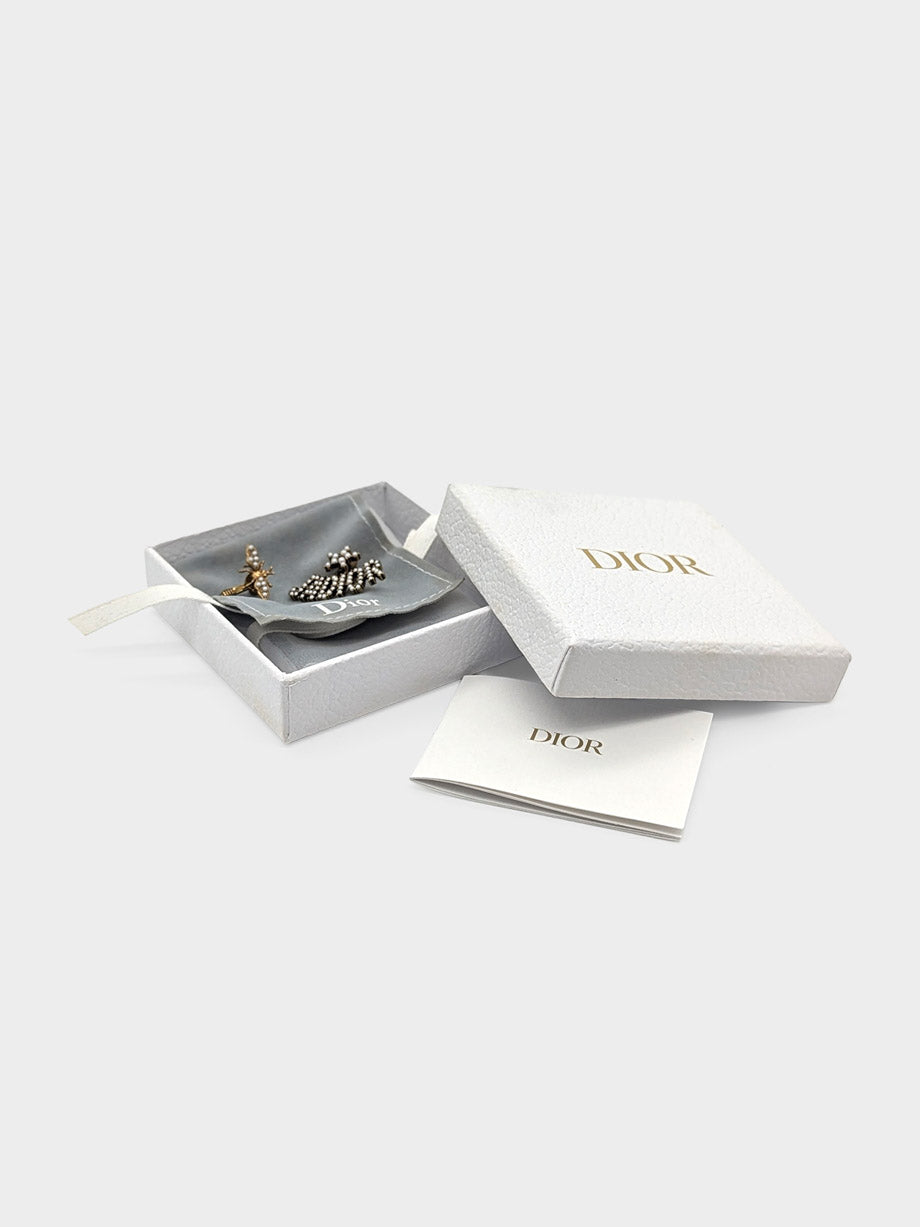These Dior earrings showcase the Maison’s signature asymmetry, featuring the J’Adior script on one side and a finely sculpted bee motif on the other. Crafted in aged gold-tone metal with subtle pearl accents, they embody Dior’s blend of femininity, symbolism, and modern edge.