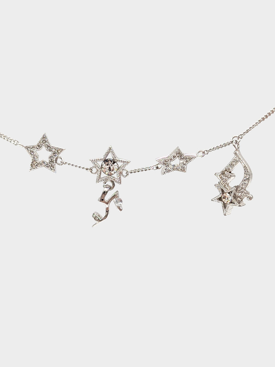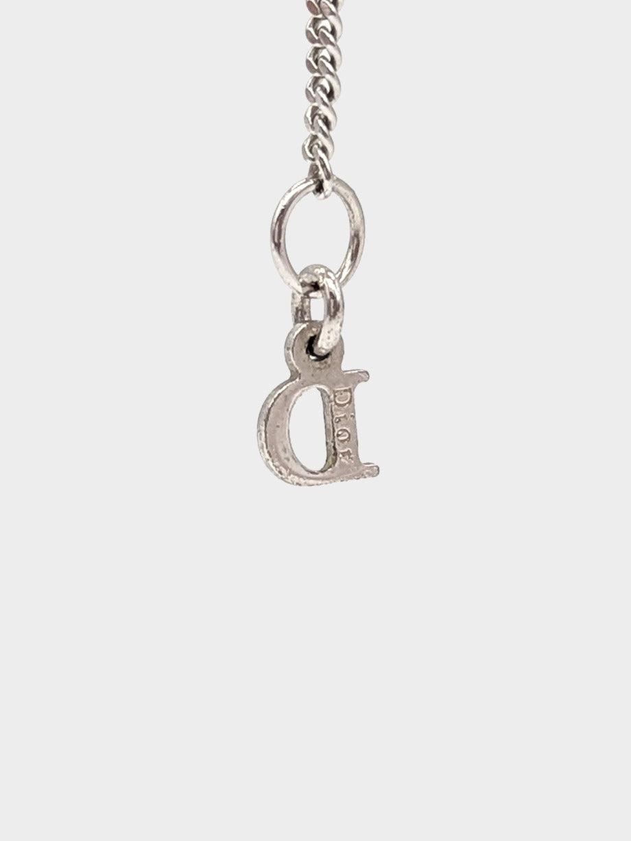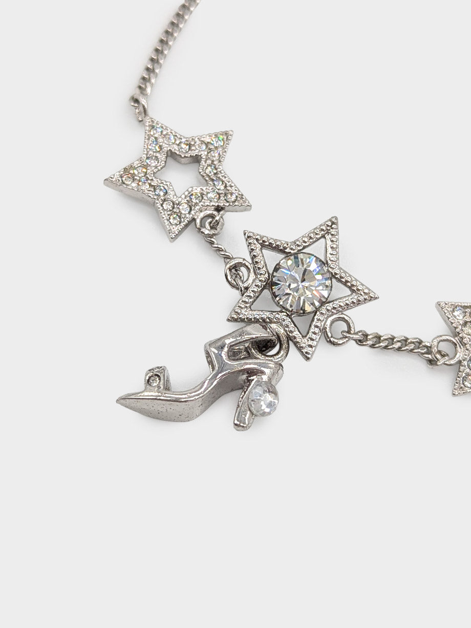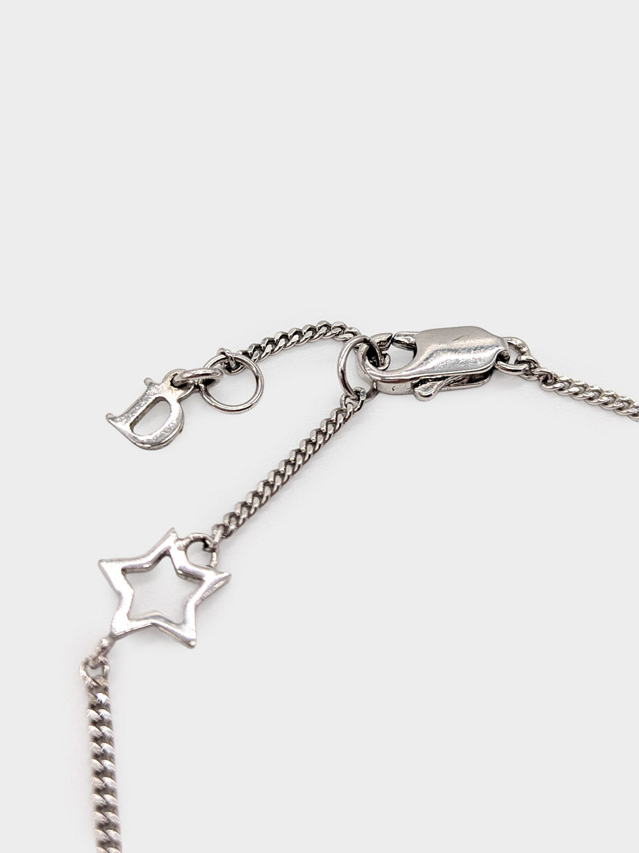 This Dior bracelet in gleaming silver-tone metal features whimsical crystal star and pump charms, capturing a sense of playful elegance. Designed for versatility, it can be worn as a subtle, understated accent on the wrist or layered with other bracelets for a more expressive, statement-making look.