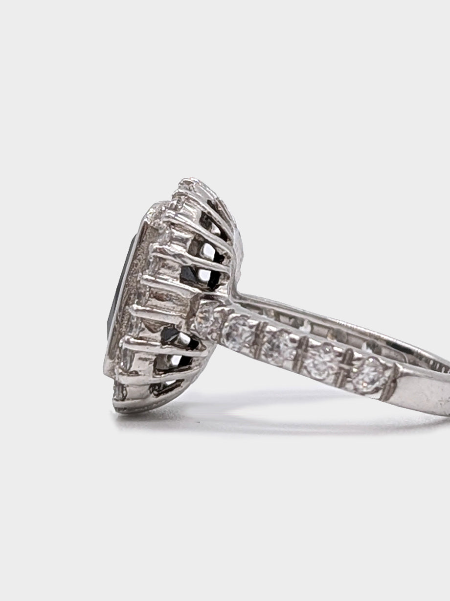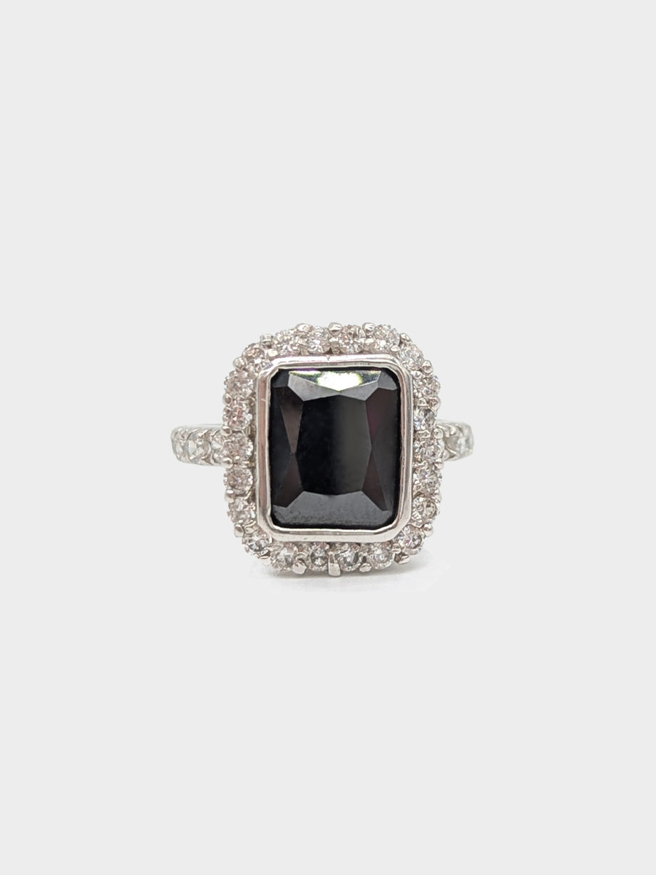 This striking ring features a radiant-cut black onyx stone, framed by a sparkling halo of cubic zirconias. Set in polished rhodium-plated sterling silver, the bold silhouette is softened by elegant detailing—making it the perfect blend of statement and sophistication.