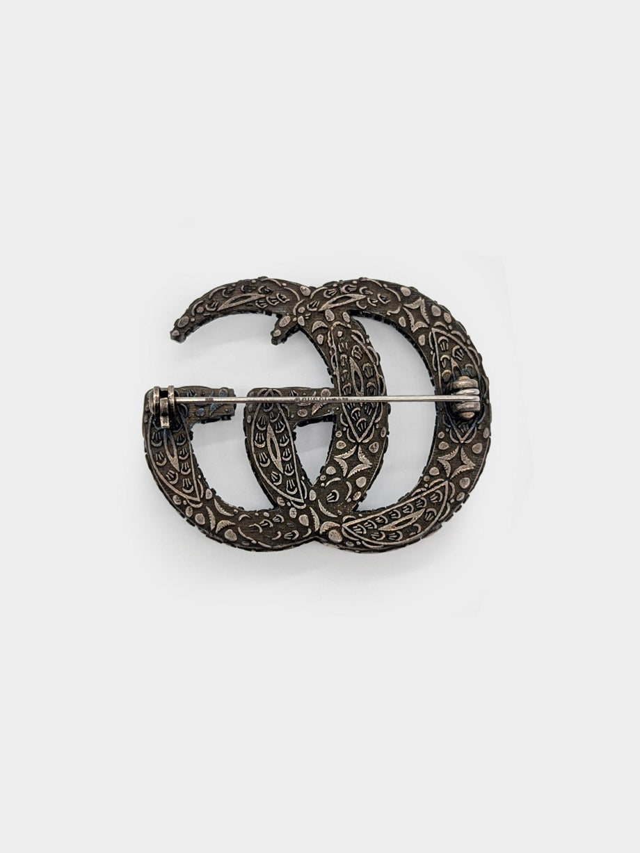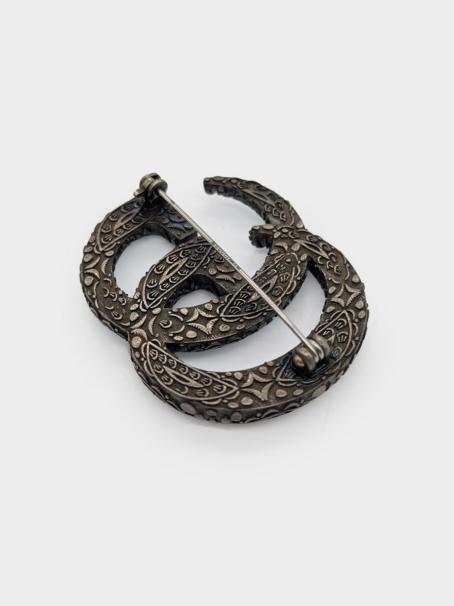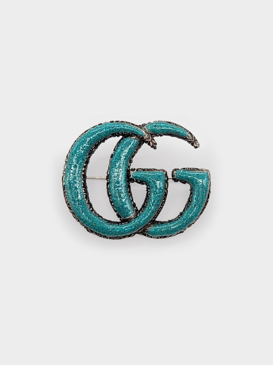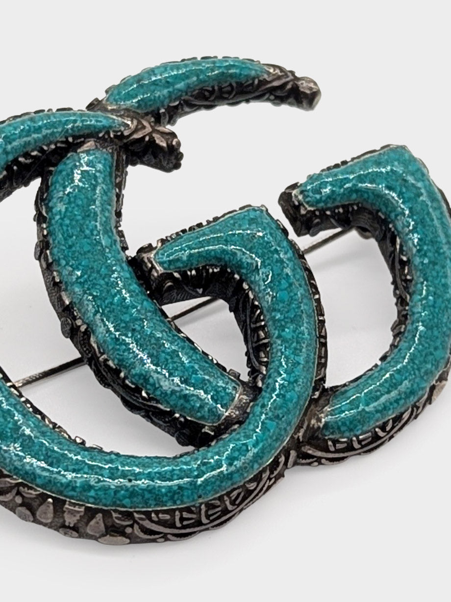 This striking Gucci brooch showcases the house’s iconic interlocking GG logo, crafted in textured sterling silver with rich turquoise enamel detailing. The aged finish adds depth and character, balancing bold colour and intricate metalwork design on the reverse.