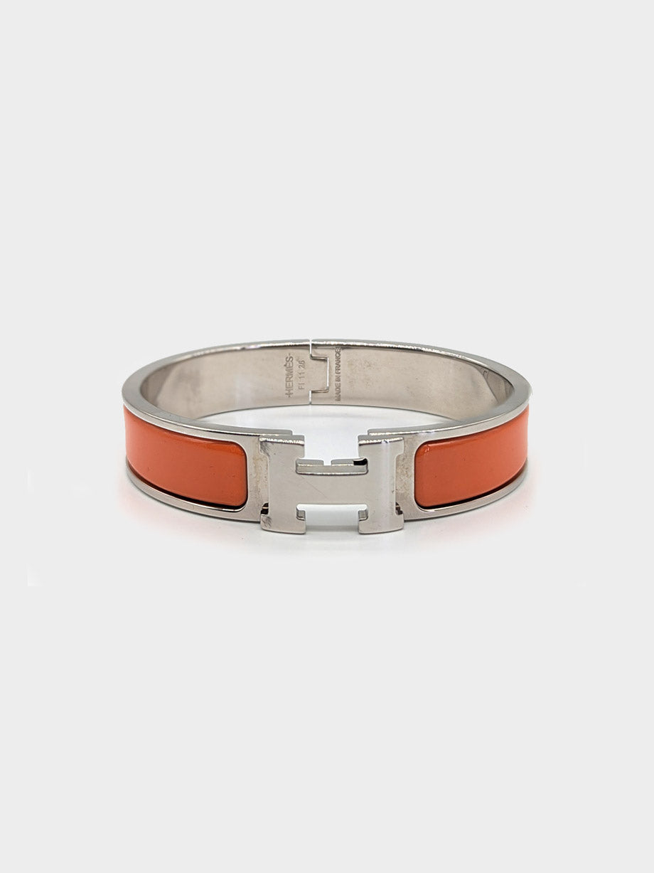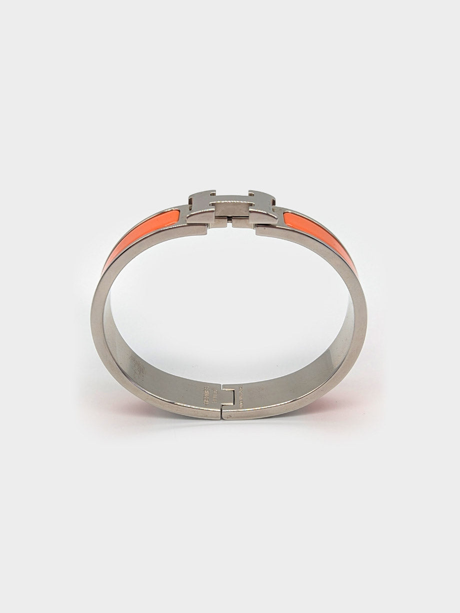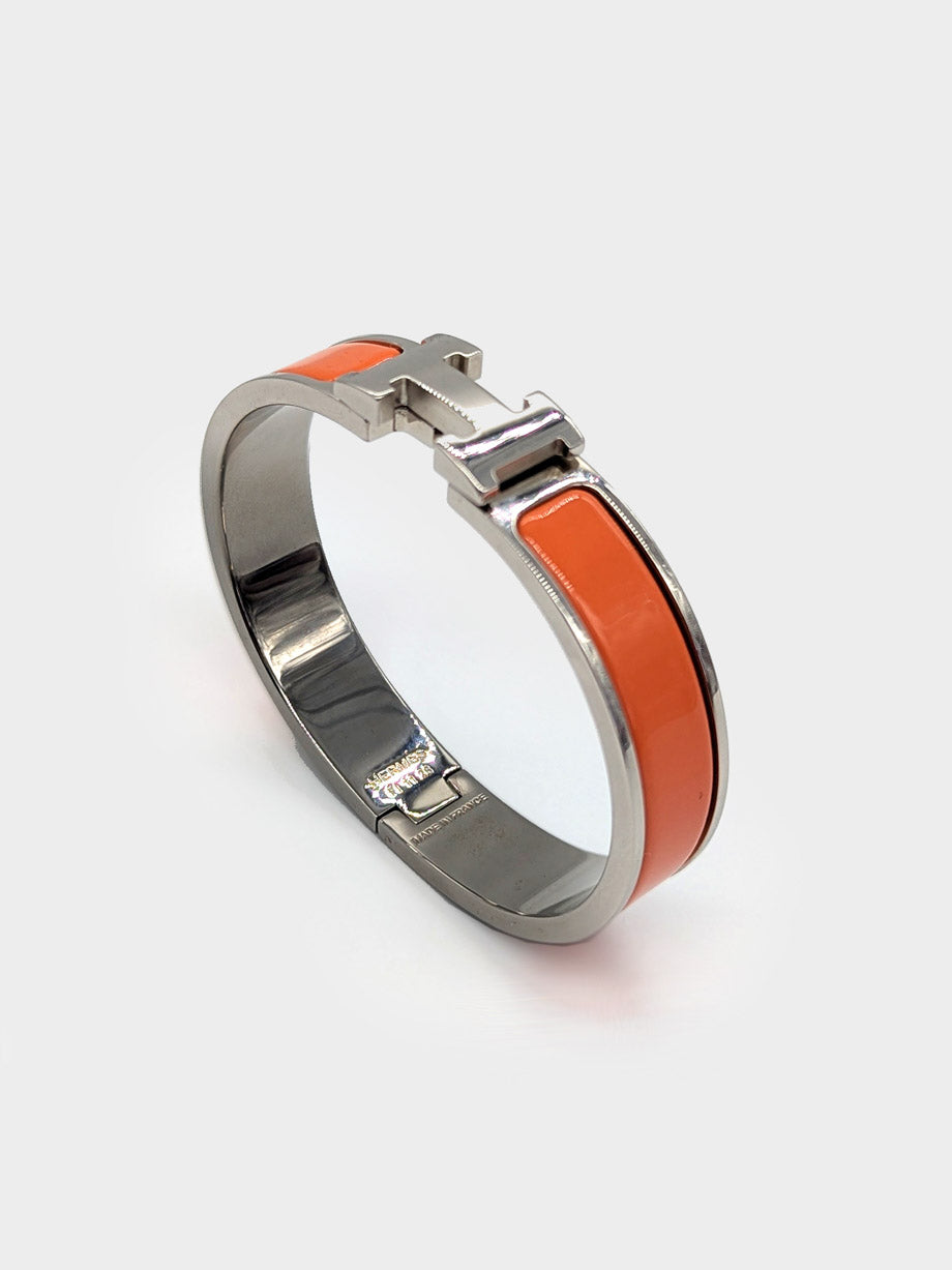 This thin Clic H bracelet features glossy Orange Fruité enamel set in polished silver-plated hardware. Designed with clean lines and an iconic hinged closure, it’s a versatile statement piece that transitions seamlessly from casual chic to evening elegance.