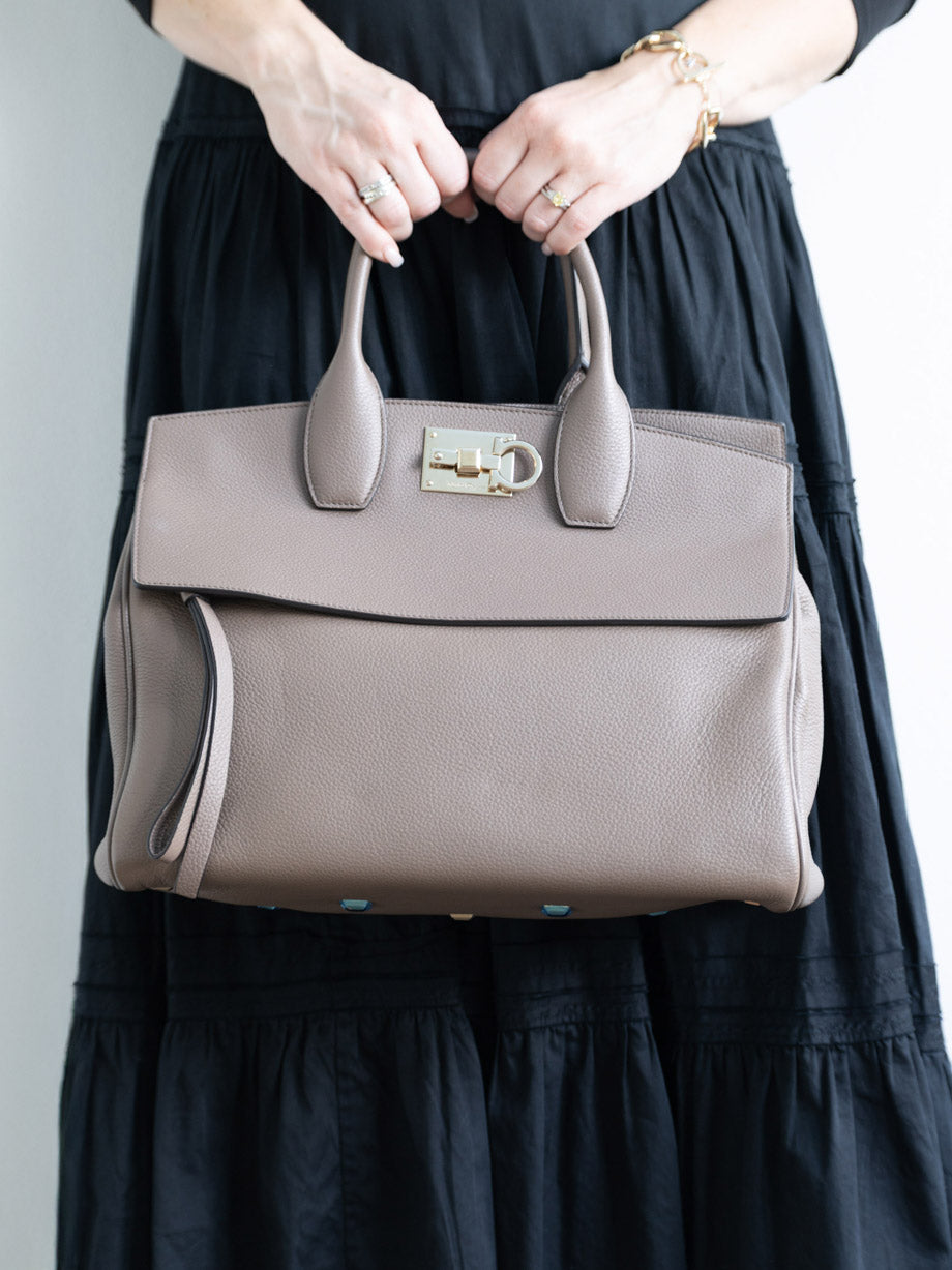 Brand New. Crafted in premium hammered calfskin, this Salvatore Ferragamo Studio bag is a refined staple in a soft, versatile taupe brown. The structured silhouette features the brand’s signature Gancini slider clasp, a zipped front pocket, and gold-tone foot studs. Designed for modern versatility, it includes both top handles and a jacquard crossbody strap, along with a removable internal zip pouch.